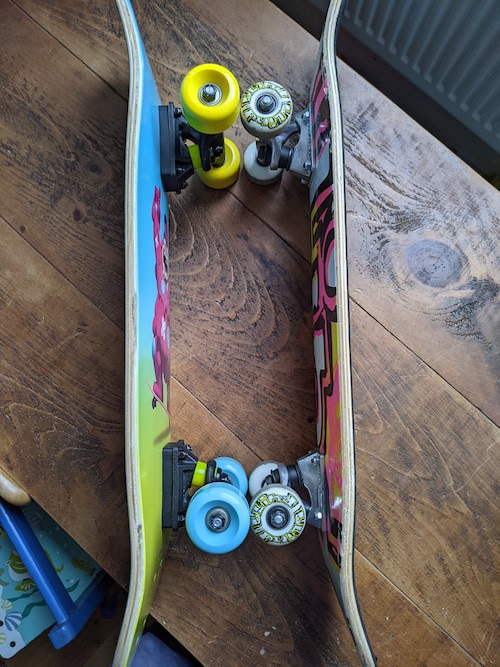 The Decathlon board has been drilled so you can set it up two ways, the default being a super long wheelbase so it’s really stable to learn to push & carve, much like a longboard. This is smart, and will get the child pushing along with stability more quickly. Why do this? Well, often, with trucks set up conventionally, the front foot will creep onto the nose, and as such the board will pivot there whilst pushing, and you’ll fall off. I will say that when you change the truck to the conventional position, so you can learn to kickturn, you will have the same struggle. You are just putting off the inevitable.