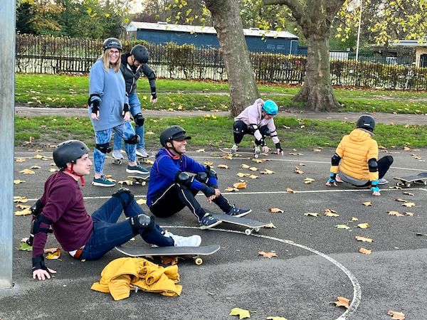 Our East London skate coaches Soren & Leo ran the lesson at Lloyd Park skatepark in Walthamstow E17. We had 12 adults, who were nearly all beginner skateboarders, join a one hour lesson followed by one hour free skate.